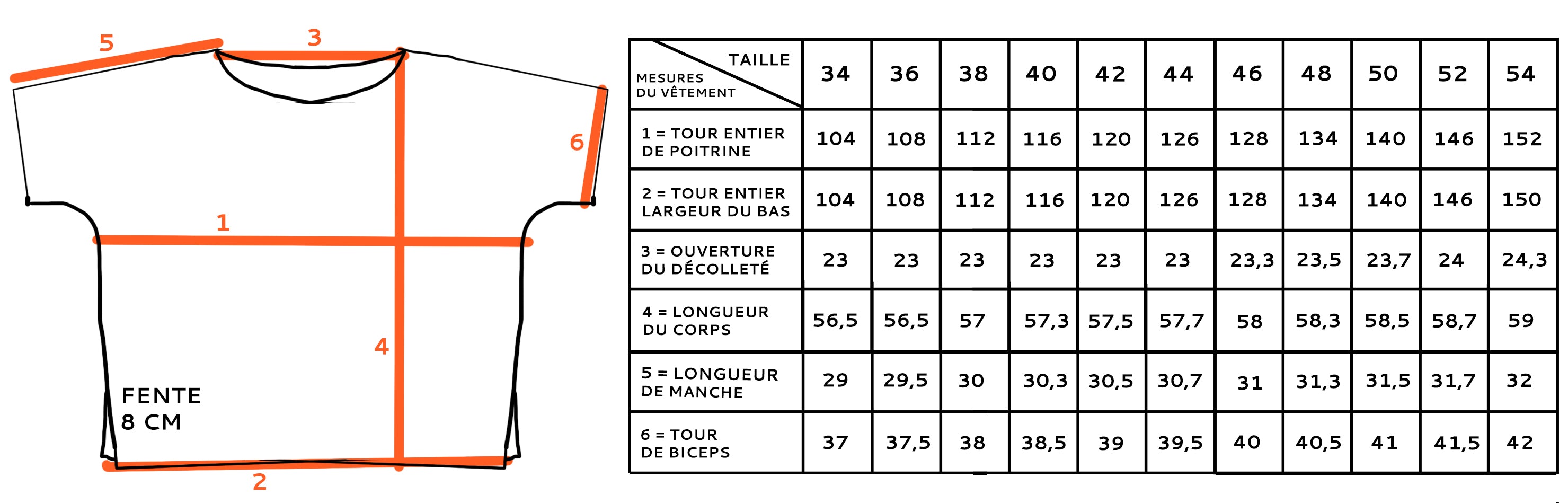 Les mesures indiquées sont celles du vêtement, en centimètres. Le top minuit a une coupe oversize, large et japonisante : vous pouvez prendre votre taille habituelle normalement, vous aurez de l'aisance et une allure fluide.