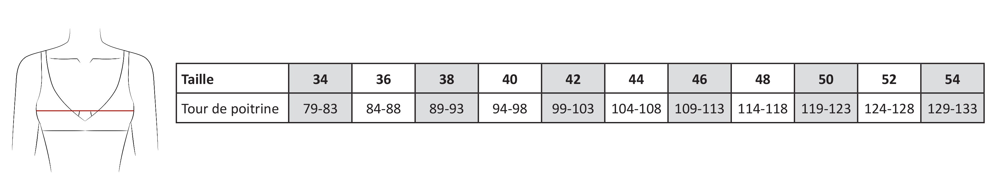 Les mesures indiquées sont celles du corps, en centimètres. Vous pouvez choisir votre taille en fonction de vos mesures, juste ce qu'il faut, ou plus serré pour plus de maintien. Si vous hésitez entre deux tailles, optez pour la taille inférieure pour davantage de maintien au niveau de la poitrine.