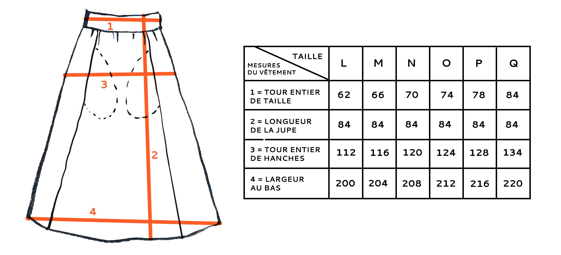 On s'en fiche de la taille !!!! C'est pas ça qui compte ici, on a donc remplacé les tailles classiques par des lettres : mesurez votre tour de taille, sans serrer ni trop lâcher, LÀ OÙ VOUS SOUHAITEZ POSITIONNER LA JUPE MIDI "JAZZ". Puis choisissez votre taille en regardant le tour de taille, en fonction du confort désiré : si vous aimez ajusté, prenez pile poil la bonne mesure ou une jupe un peu plus étroite à la taille que votre tour de taille (l'élastique est souple, très doux et très élastique). Si vous aimez confort, prenez pile poil ou 1 ou 2 cm d'aisance en plus. Pour les hanches, aucune inquiétude, elles passeront, grâce aux fronces à la taille et aux hanches amples !