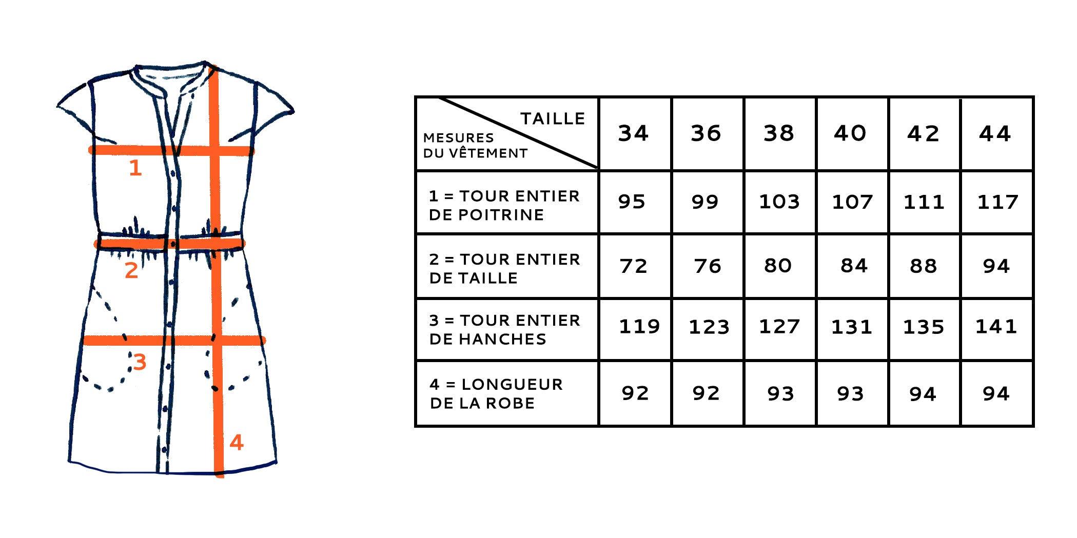 Les mesures indiquées sont celles du vêtement, en centimètres. Pour choisir votre taille, regardez surtout la poitrine. Mesurez votre propre tour de poitrine sans serrer ni trop relâcher. Puis choisissez votre taille en gardant en tête que vous devez avoir entre 2 et 6cm d'aisance :-) Donc si vous faites 95 de poitrine, il vous faudra un vêtement qui mesure entre 97 et 101 de tour de poitrine. ET les hanches passeront car nous les avons prévu larges :-)