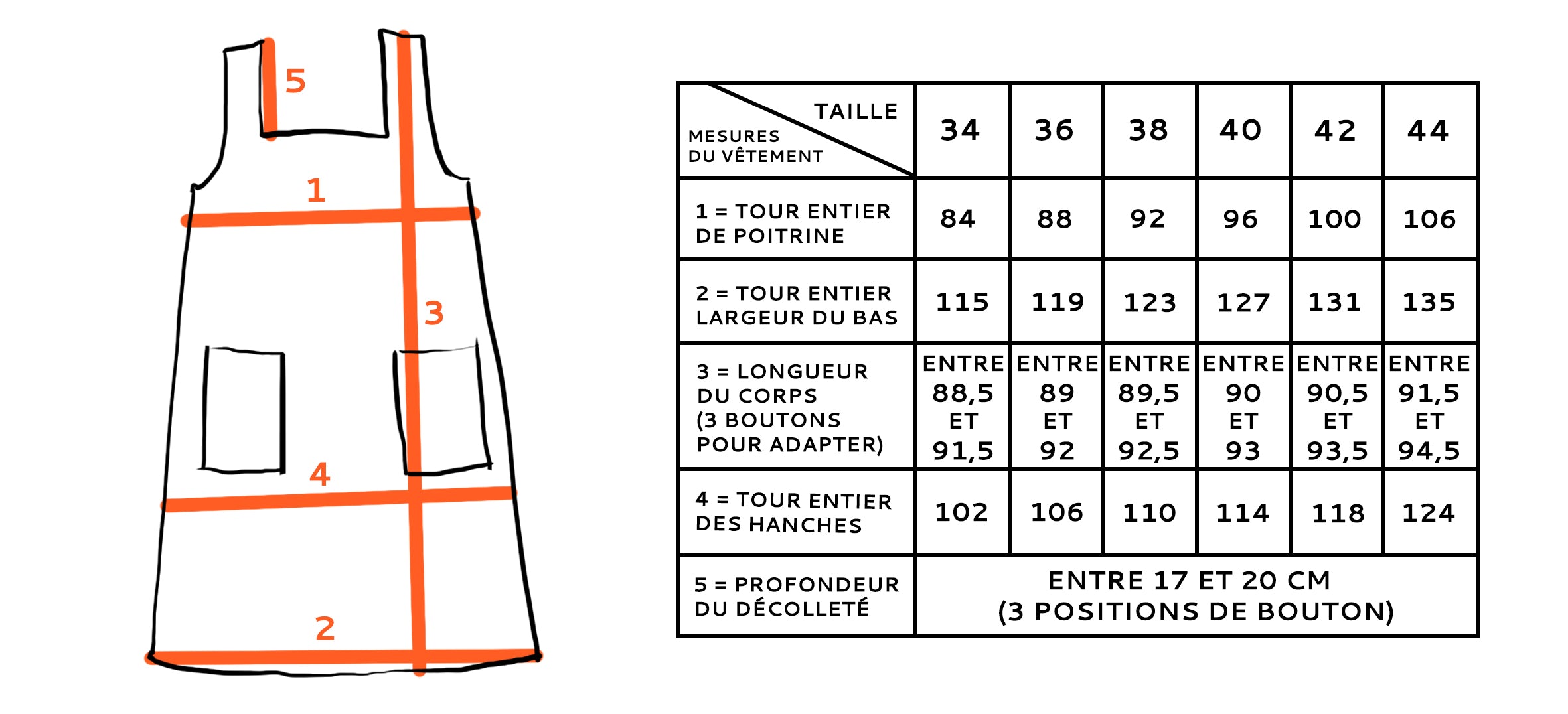 Les mesures indiquées sont celles de la robe tablier, en centimètres. Pour choisir votre taille, regardez surtout la poitrine. Mesurez votre propre tour de poitrine sans serrer ni trop relâcher. Puis choisissez votre taille en gardant en tête que vous devez avoir entre 2 et 6cm d'aisance :-) Donc si vous faites 95 de poitrine, il vous faudra un vêtement qui mesure minimum entre 97 et 101 de tour de poitrine. ET les hanches passeront car nous les avons prévu larges :-)