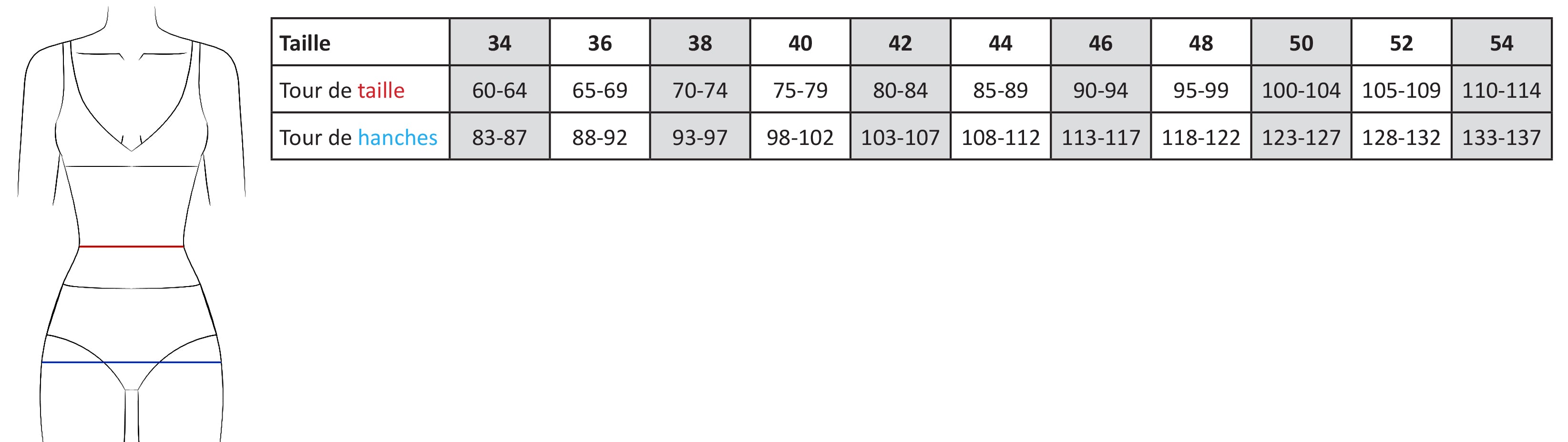 Les mesures indiquées sont celles du corps, en centimètres. Vous pouvez choisir votre taille en fonction de vos mesures, juste ce qu'il faut, ou plus lâche pour plus de confort. Si vous êtes entre deux tailles, choisissez la taille au-dessus pour un confort optimal.